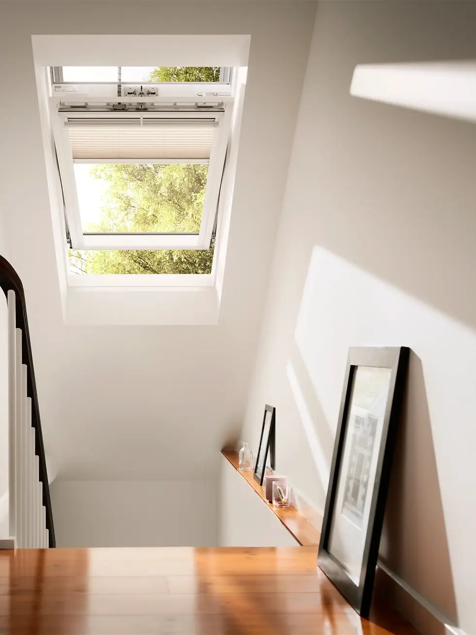 A roof window that opens is ideal for airflow — especially in kitchens and bathrooms. In rooms where privacy matters, consider options with built-in blinds or frosted glass panels.